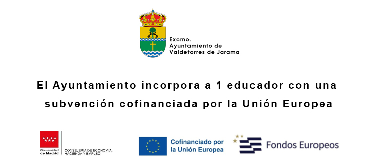 El Ayuntamiento de Valdetorres de Jarama incorpora a 1 persona joven desempleada gracias al Programa de Fomento del Empleo Juvenil con las Corporaciones Locales en el marco del Programa FSE+2021/2027. El importe de esta subvención asciende a 22.646,64 euros y está cofinanciada con fondos procedentes del Fondo Social Europeo Plus (FSE +) y por la Comunidad de Madrid.