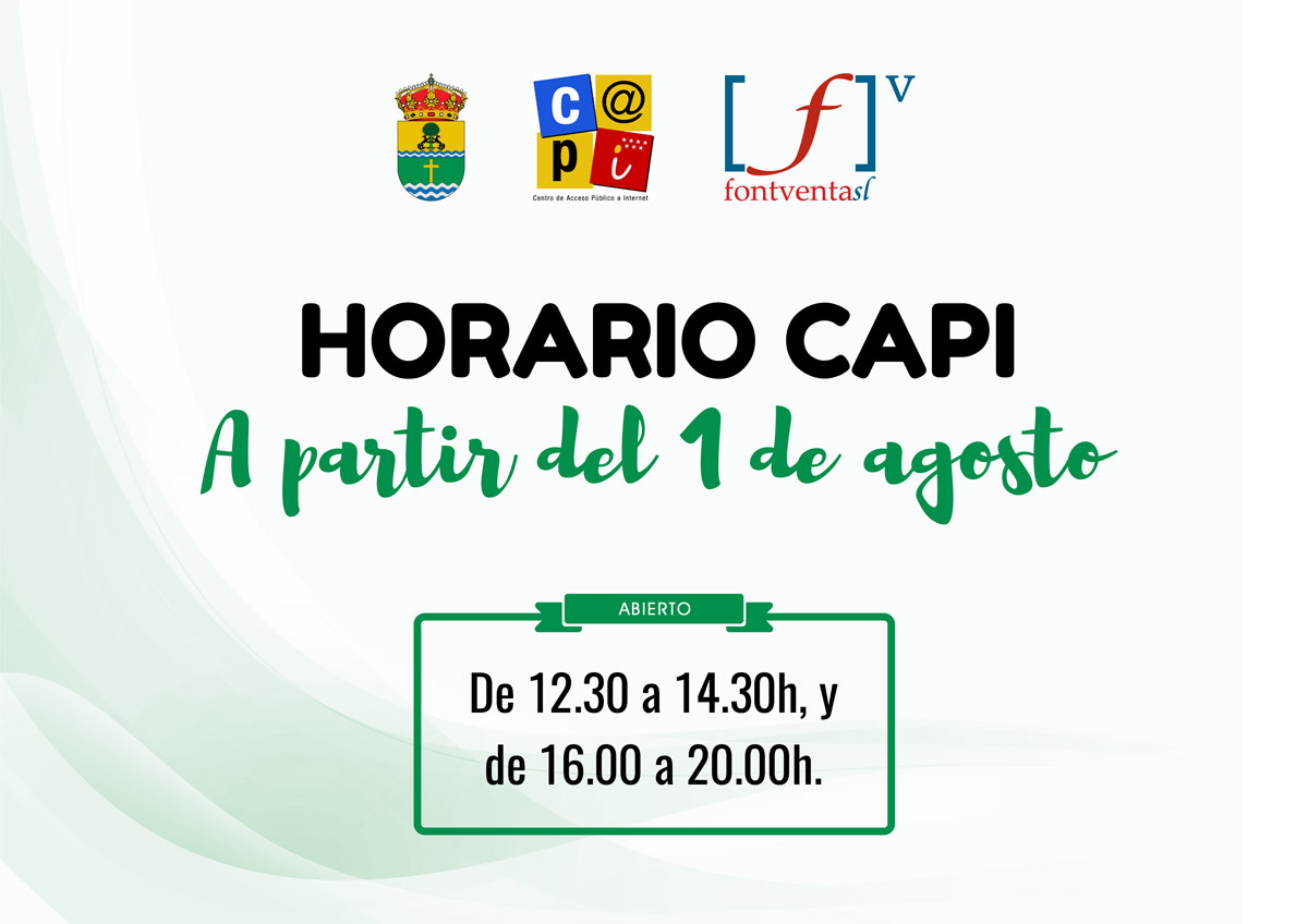 A partir del miércoles 1 de agosto (incluido) podrás seguir acudiendo al Centro de Acceso Público a Internet (CAPI) de Valdetorres de Jarama en un horario especial de verano, que abrirá sus puertas todos los días de diario desde las 12.30 hasta las 14.30h, y desde las 16.00 hasta las 20.00h.