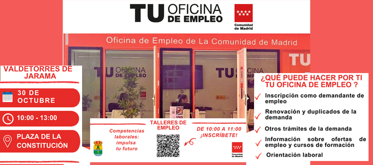 La Oficina de Empleo Móvil estará en Valdetorres de Jarama el miércoles 30 de Octubre, para informar de los recursos de empleo y formación que la Comunidad de Madrid pone a disposición de la personas en búsqueda de empleo. Durante la jornada podrás realizar trámites en la demanda de empleo (renovación, modificaciones, información, etc.) y además podrás participar en los talleres de empleo:
