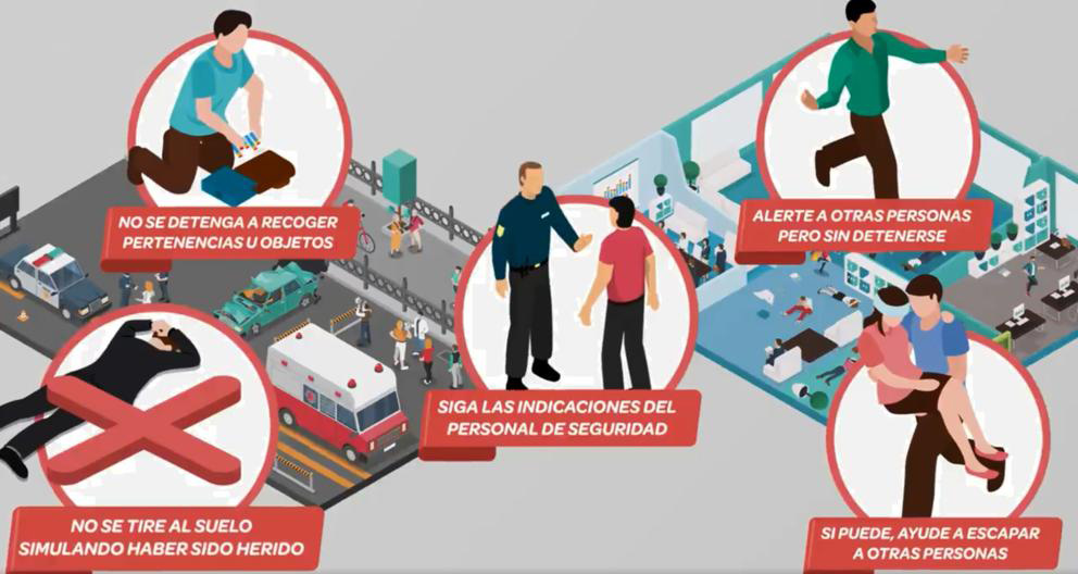 Conocer la ubicación de las salidas de emergencia, evitar manipular objetos sospechosos, huir del lugar sin ser visto por el terrorista, esconderse de él o jamás fingir estar muerto son algunas recomendaciones que lanza el Ministerio del Interior a los ciudadanos para saber actuar en caso de atentado terrorista.