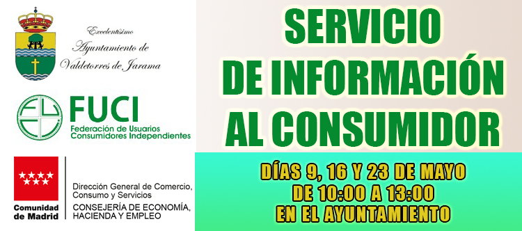 El Ayuntamiento de Valdetorres de Jarama, junto con la Federación de Usuarios Consumidores Independientes (FUCI) y la Dirección General de Comercio, Consumo y Servicios de la Comunidad de Madrid, ofrecen el SERVICIO DE INFORMACIÓN AL CONSUMIDOR a través del cual los vecinos y vecinas de nuestro municipio podrán realizar consultas o presentar reclamaciones relacionadas con consumo ante un representante de FUCI.