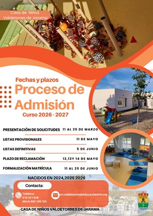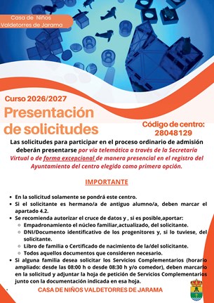 PLAZO DE PRESENTACIÓN DE SOLICITUDES DE ADMISIÓN. CURSO ESCOLAR 2026/2027. CASA DE NIÑOS DE VALDETORRES DE JARAMA